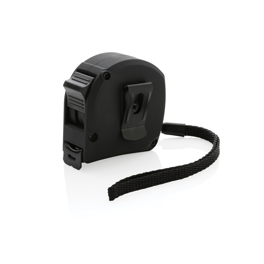 5 metre tape made with RCS (Recycled Claim Standard) certified recycled ABS. Total recycled content: 11% based on total item weight. RCS certification ensures a completely certified supply chain of the recycled materials. The bamboo plate is made from 100% FSC bamboo. Casing with luxury soft touch finish. With release/lock button. With 19mm single sided tape, yellow with black carbon steel hook. With polyester wrist strap. Packed in FSC® mix kraft packaging