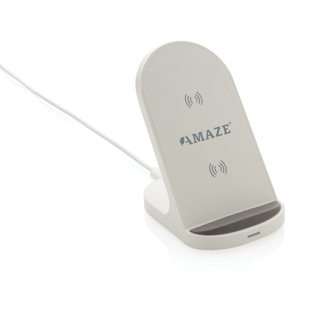15W wireless fast charger stand with two integrated charging coils. The stand supports both horizontal as well as vertical charging. Made with RCS (Recycled Claim Standard) certified recycled materials. Total recycled content: 56% based on total item weight. RCS certification ensures a completely certified supply chain of the recycled materials. Including 150 cm PVC free recycled TPE material charging cable. ; Item and accessories 100% PVC free. Packed in FSC mix packaging. Wireless charging compatible with Android latest generations, iPhone 8 and up. Input: 12V/1.67A. Wireless Output: 9V/1.5A 15W.
